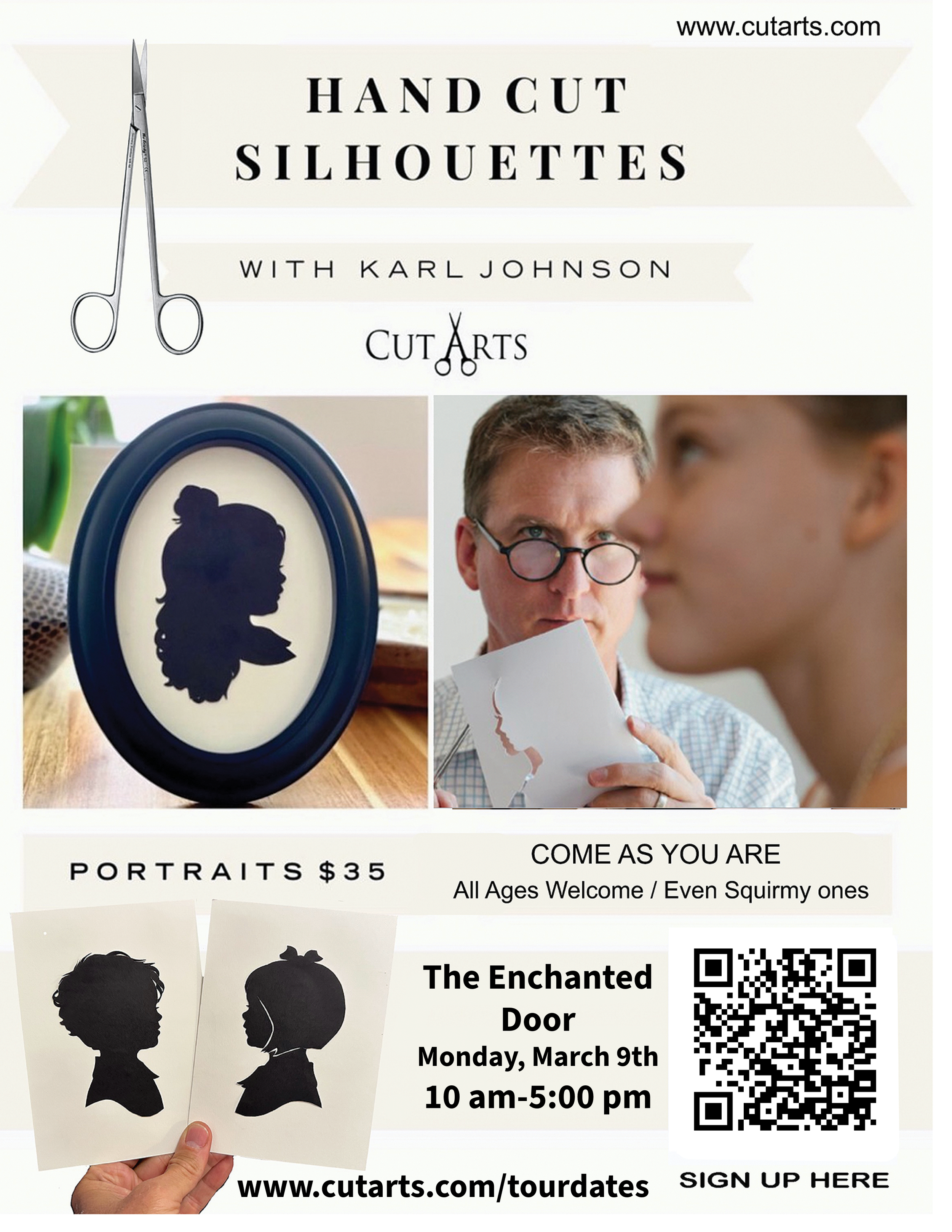 Please join Silhouette Artist Karl Johnson at our store where he will be creating hand cut silhouette portraits! Each one takes just minutes and all ages are welcome even the squirmy ones. Original Silhouettes are $35. Please reserve one time slot per person, as duplicates are cut at the same time.